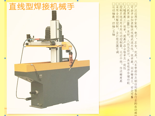 直線型焊接機器人采用示教型編程方式,只要用手動按焊接軌跡走一次,系統自動記錄焊接軌跡大大節省編程時間,操作應用十分便利。