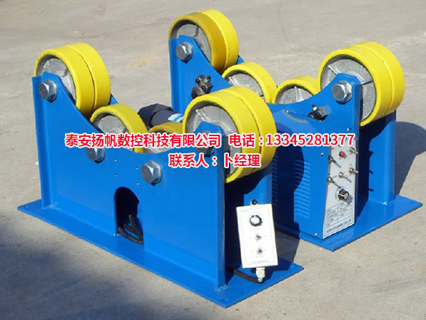 焊接滾輪架,是利用主動滾輪與焊件之間的摩擦力帶動工件旋轉的變位設備。滾輪架可根據工件直徑大小自動調節輪組的擺角,并能自動調心。滾輪架主要用于管道、容器、鍋爐、油罐等圓筒形工件的裝配或焊接,滾輪架當與焊接山東操作機、焊接電源配套時,可以實現工件的內外縱縫和內外環縫焊接。滾輪架充分吸取了國內外同類產品的優點,具有工藝、質量可靠、操作簡單、傳動噪聲低、工件回轉平穩等優點。滾輪架是實現壓力容器及筒狀工件焊接自動化、半自動化的必備設備。自調式滾輪架滾輪驅動采用變頻調速電動機,可按焊接規范進行無極調速,具有焊接速度調速范圍寬、轉動平滑性好、低速特性硬等特點。當對主、從滾輪架的高度作適當的調整后,也可進行錐體、分段不等徑回轉體的裝配與焊接。對于一些非圓長形焊件,若將其卡在特制的環形卡箍內,也可在焊接滾輪架上進行裝焊作業。特別是自調式、可調式焊接滾輪架系列